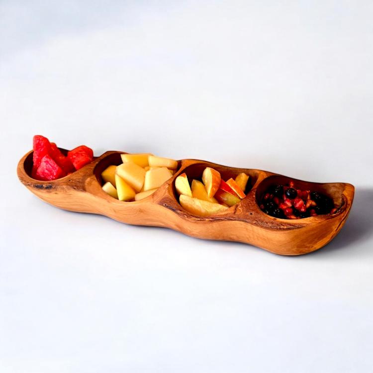 Four-Cavity Tunisian Olive Wood Snack & Tapas Bowl – Rustic Elegance for Entertaining & Storage