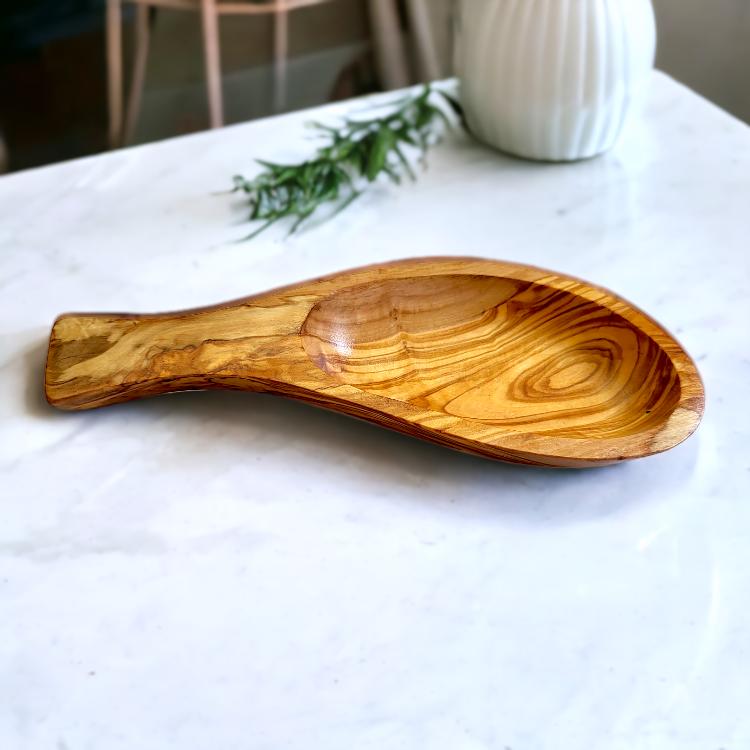 Add a touch of rustic beauty and natural functionality to your home with this olive wood leaf-shaped bowl – where practicality meets artisan design.