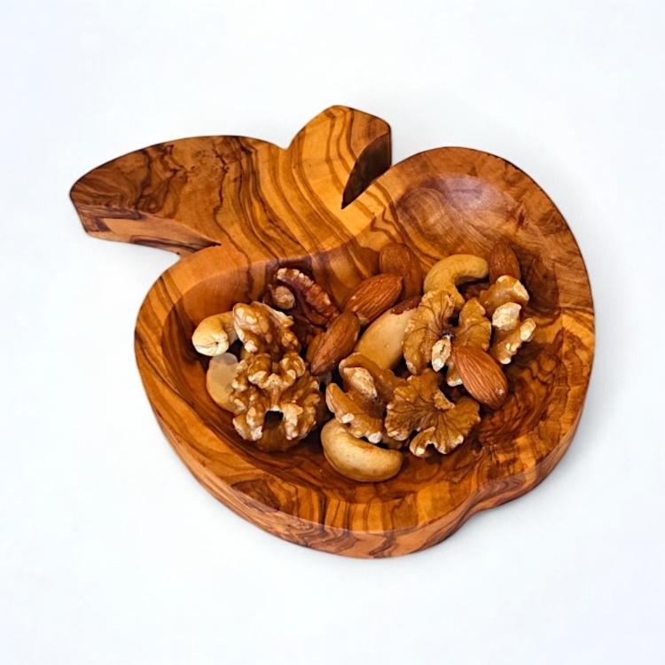 Bring natural beauty and versatility into your home with this handcrafted apple-shaped olive wood dish. Perfectly blending style, function, and sustainability, this unique piece is ideal for adding a touch of rustic charm to any room.