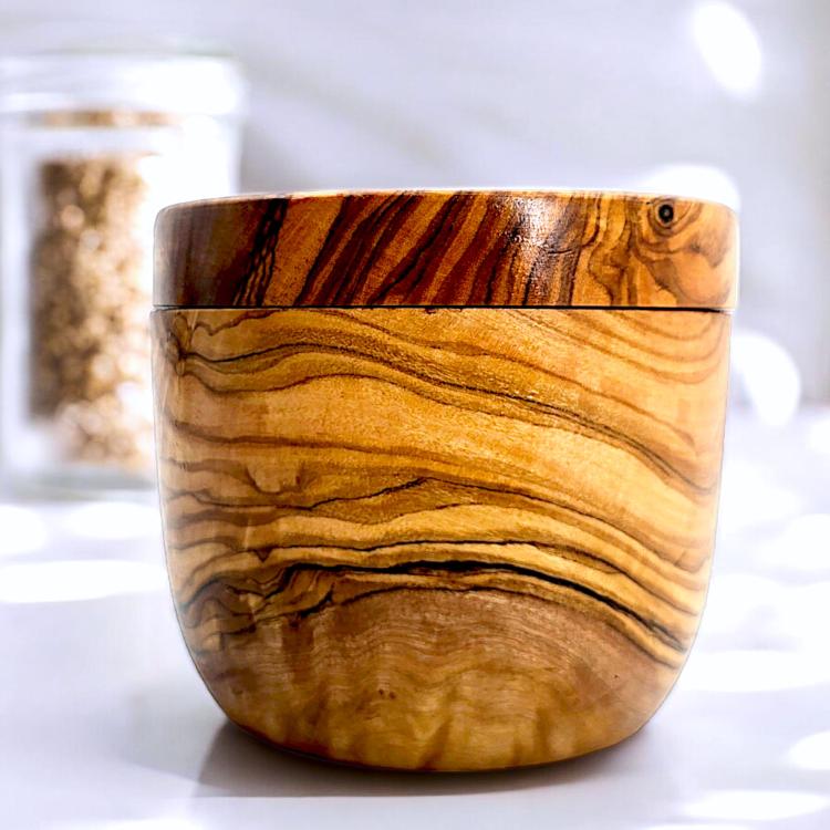 This stunning handcrafted olive wood lidded storage pot from Lazer Craftz is a versatile, elegant addition to any home. Made from sustainably sourced Tunisian olive wood, every pot showcases its own unique grain patterns — no two pieces are ever the same. With its smooth, rounded form and snug wooden lid, it is both practical and decorative.